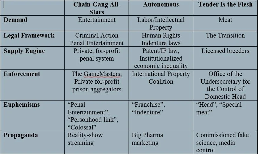 Beyond intense gore/body-horror, they share a common theme: humans owning other humans (or pieces thereof). Eventually, my head spun off and I had to get it out: here’s Part 1 of my take on how the authors—or you might— make it work.