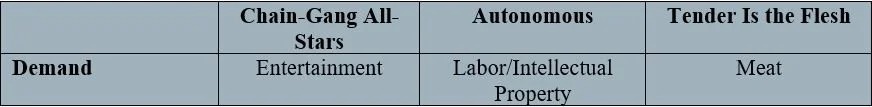 The only benefit arises when the property can be forced to produce something that the owner wants to consume. In economic terms, there must be a demand for something that human assets can supply—a demand that drives society to contort itself in accommodation. Each of our three novels imagined these demands differently, as below: